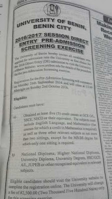 The University of Benin hereby invite all candidates who applied for admission into the University as First Choice for the 2016 Direct Entry (DE) Admission to visit the University Of